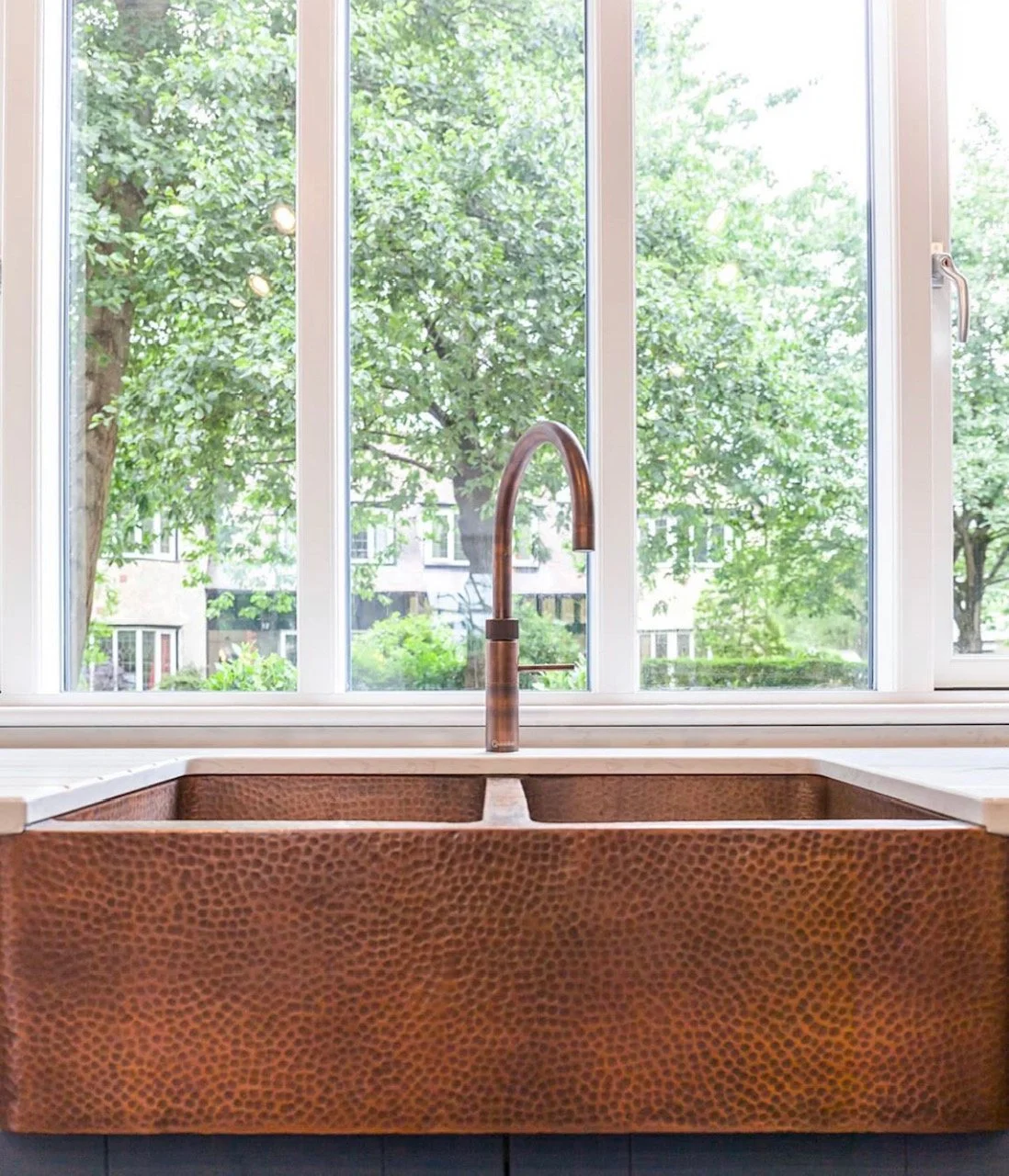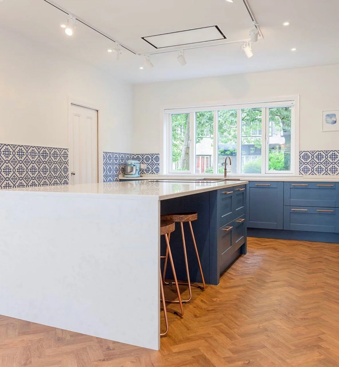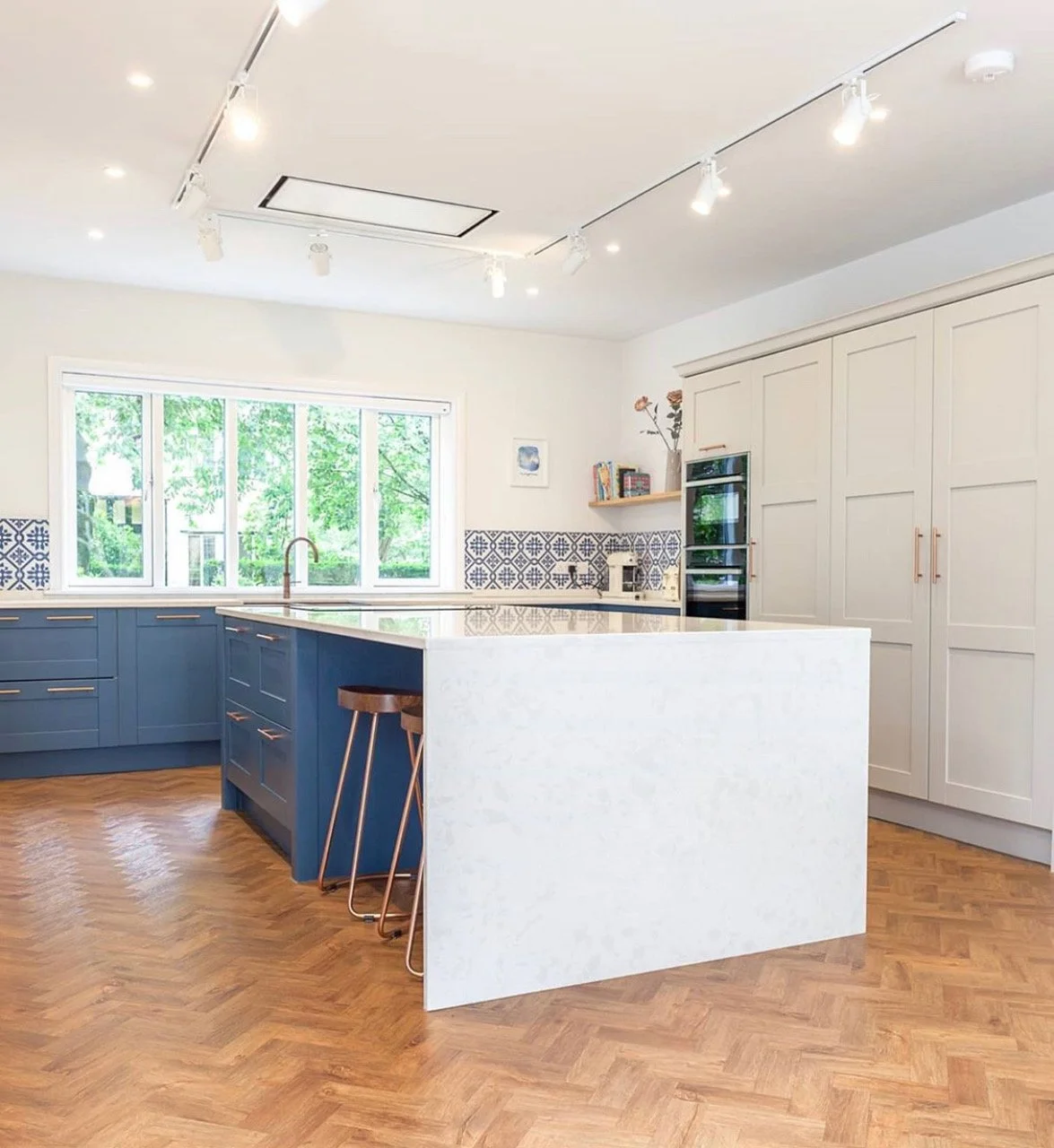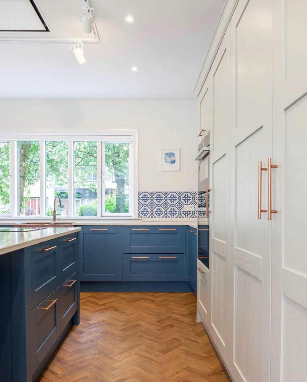 The kitchen was given a bold feel with Farrow & Ball Stiffkey Blue cabinetry and blue patterned Bert & May tiles which continue around the wall next to the island. The quartz waterfall edged island and copper hammered sink also add character to the space. The taller cabinets are in lighter Purbeck Stone and corporate the double ovens, a larder and a full height integrated fridge and freezer. In the attic bathroom we used scallop tiles in different blues to create a dramatic look combined with gold brassware and a simple white sink area.
